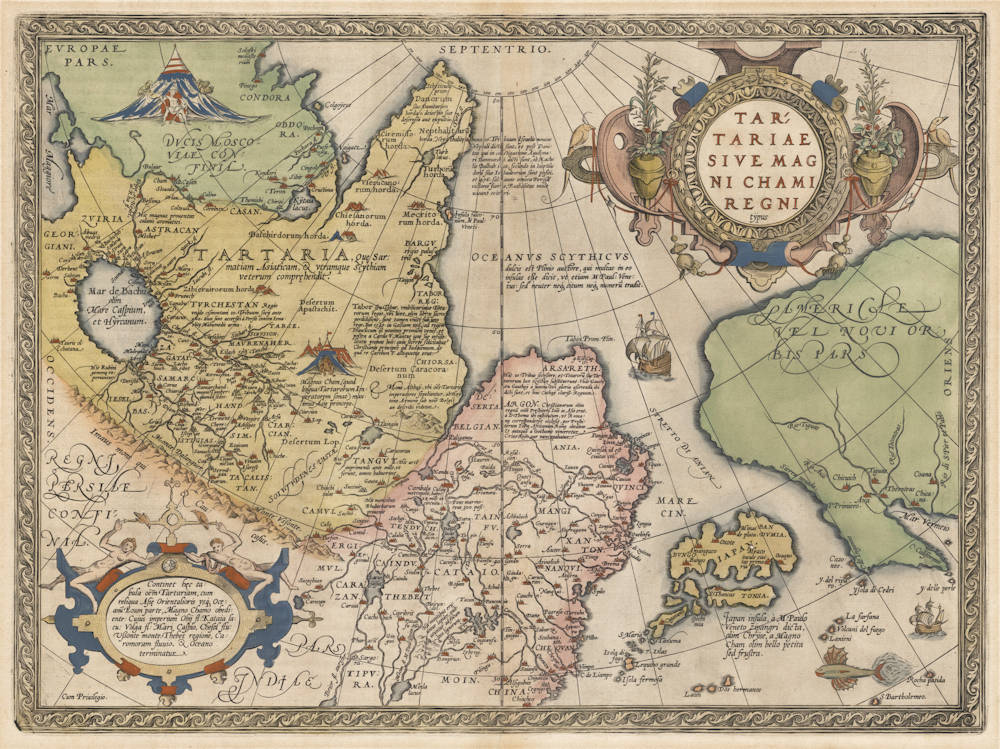The map offers a detailed view of the almost unknown areas of Tartaria, Cathay (China), Japan (closer to America than to Asia!), and California. The strait of Anian separates Asia and America, and a navigable North-Eastern passage is shown from Europe to Japan and China, complete with sailing ship. China itself is on the map twice, once as Marco Polo's Cathay and once as the newly discovered Empire of China that the Portuguese had reached by sea. Scale ca 1 : 20,000,000.