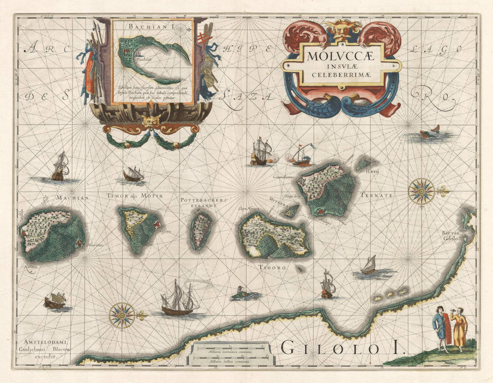 Ever since the first Portuguese expedition under Albuquerque from Malacca in 1511, the Spice Islands, or Moluccas, had been the great prize to Europeans in the East. Great attention was therefore paid by navigators and mapmakers to the accurate depiction of the islands and routes to them, both from Europe as well as from other European strongholds in the East. The early Portuguese navigators soon found that the most important of the Spice Islands were Ternate, Tidore (Tidoro on Willem Blaeu's map), and Halmahera (part of which is shown along the bottom of this map by a rendering of its native name as Gilolo) for cloves, and Amboina and the Banda Islands for nutmeg and mace.