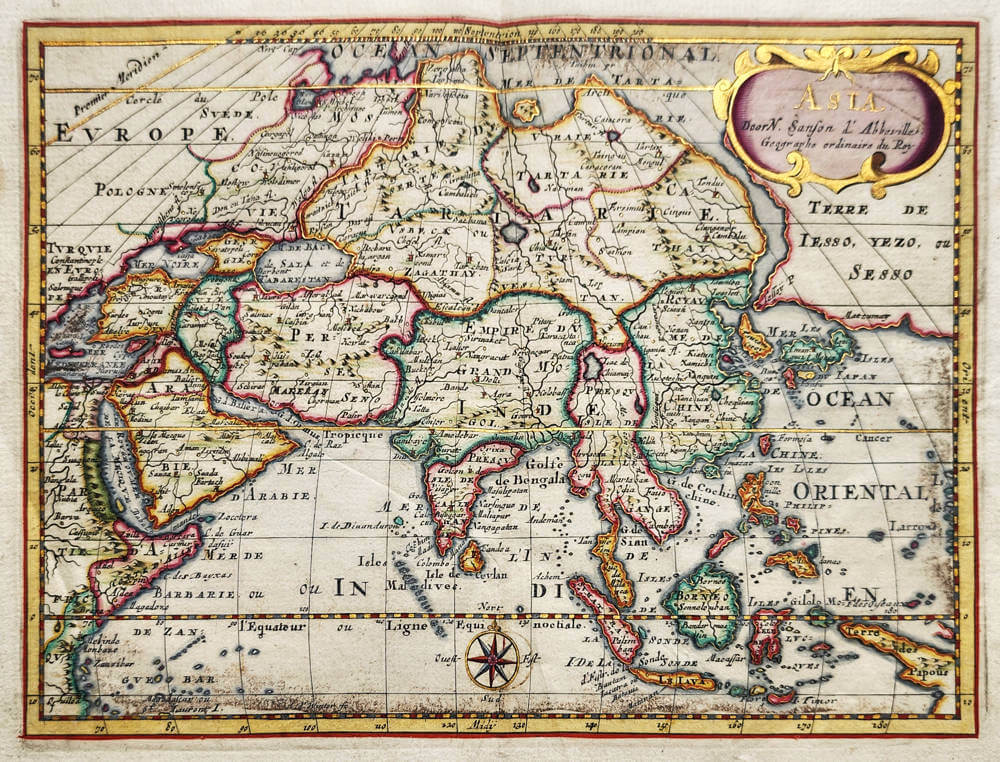 A very attractive mid-17th century quarto-sized map of Asia from Cape York all the way to Egypt, including the Arabian peninsula and eastern part of Africa, while also including the Land of Jesso which is directly to the north of Japan. Showing detailed knowledge of the small islands dotting the continent.