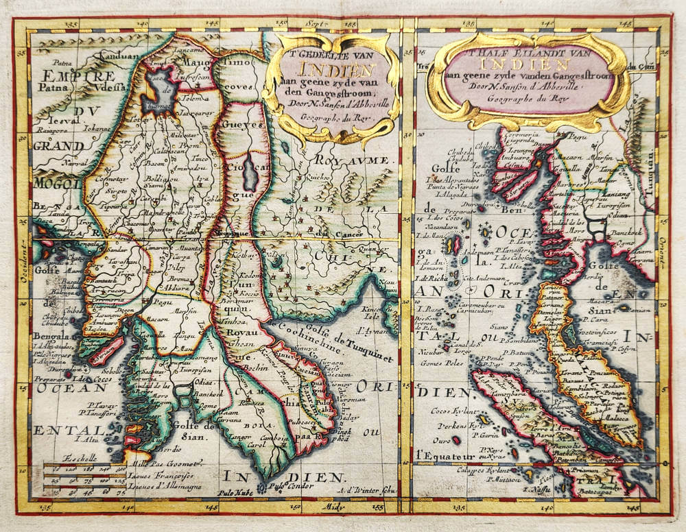 Engraved and signed by Antoine de Winter of Amsterdam and compiled and published by the great French Cartographer Nicolas Sanson (1600-1667) in his 'Pocket Atlas of Asia' published in 1652. This example is from a Dutch edition of the atlas published between 1653-60.
