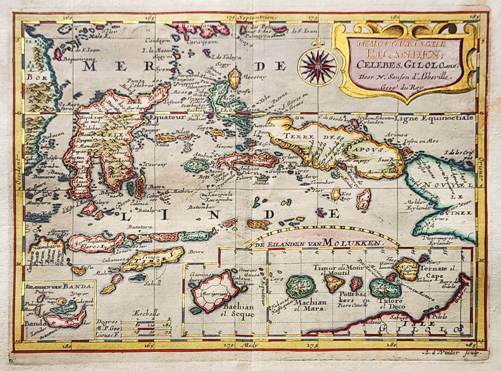 A very attractive mid-17th century quarto-sized map of the Moluccas including Celebes (Suawesi), Giololo (Halmahera), the Lesser Sunda Islands, Papua New Guinea and the spice-producing islands with enlarged insets of the Northern and Southern Moluccas.