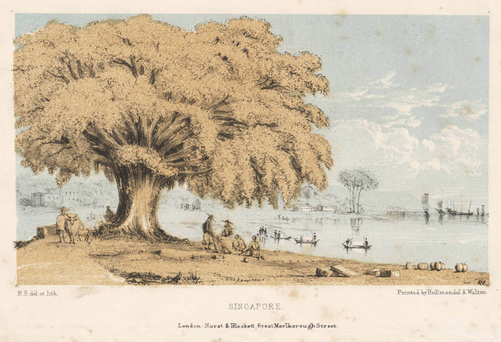 This interestingly colored lithograph is tinted but also feautures a colored sky giving it gold and light sky-blue tones. The view shows a family picnic in a park by a river in early Singapore. Printed in London by Hullmandel & Walton, it was published by Hurst & Blackett.