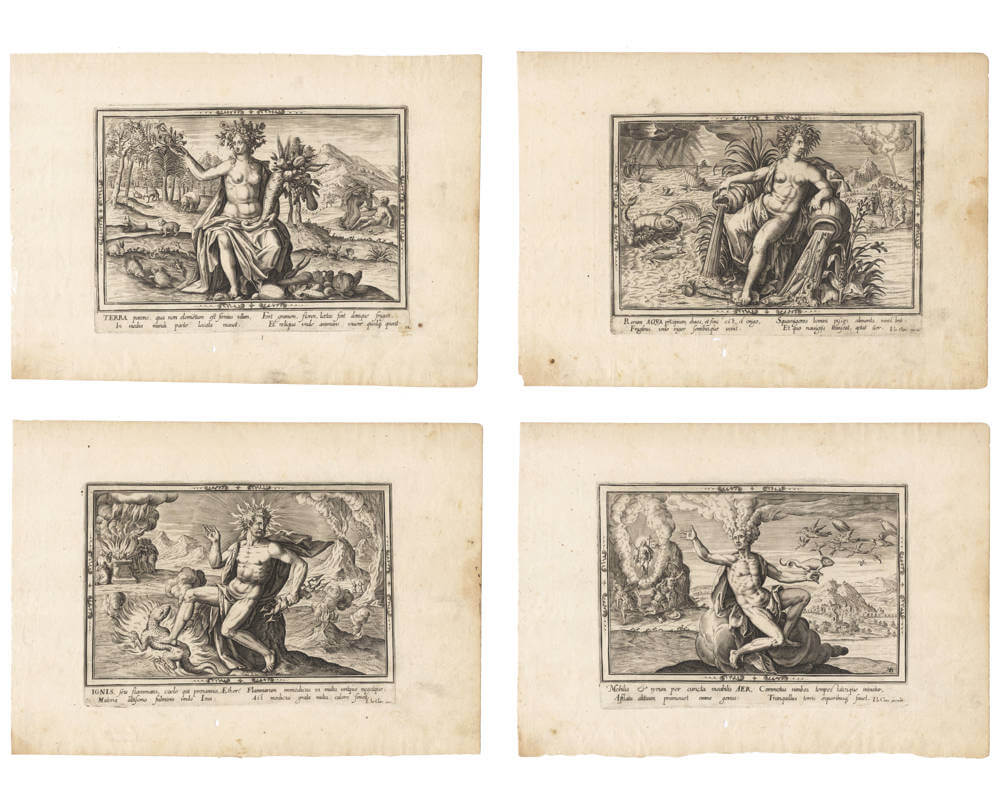 Complete and uniform series translated in counterpart and in rectangle from the analogous collection in an oval engraved by Adriaen Collaert. On the plate representing the Air, in the lower right corner, the monogram "AB" appears; in the margin at the end of the Latin verses, the "excudit" by Jean le Clerc is present on three out of the four engravings.