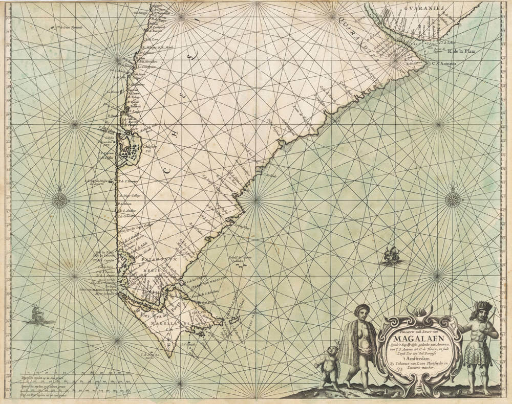 The chart gives a detailed nautical view of the Dutch explorations and discoveries around Magellan's Strait, Magellanica, the Atlantic coasts of South America from Rio de Plata southwards and the Pacific coasts of South America from Valparaiso southwards.