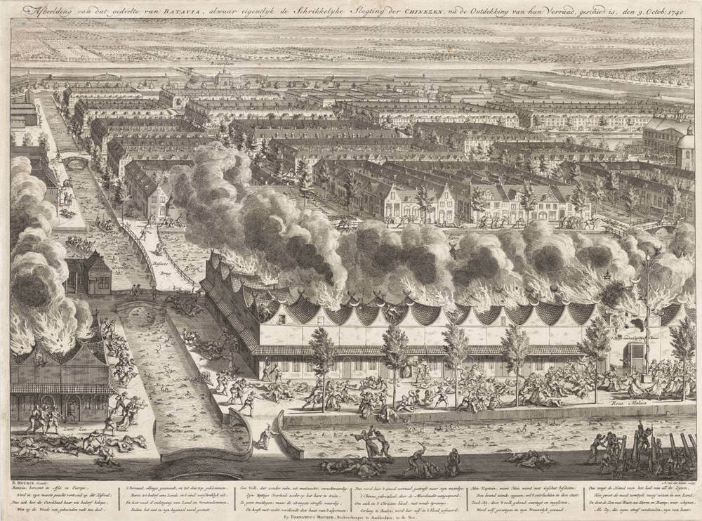 Extremely rare separately issued broadsheet of the 1740 Batavia massacre. The image is engraved and etched by artist Adolf van der Laan and published by Bernardus Mourik in Amsterdam.