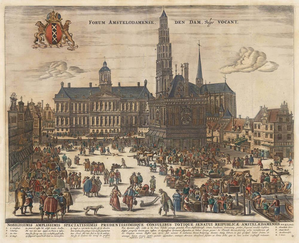 "Come, Spectator, feast your eyes upon this brief tableau, and with your mind stroll through the Amsterdam Forum, remarkable with the throng of citizens, residents, and foreign nations: Consider, foreign Guest, the Courthouse, a vast work, and a wonder of the most elegant symmetry, whether Europe holds its equal! Here is the sacred place of Themis, and the secret repository of the city: Behold the new Temple with its illustrious tower under the name of St. Catherine, dedicated to Piety and Religion: Finally, the Scale, in which whatever the East holds, and both thresholds of the Ocean send, is weighed daily, and such abundance of goods is marveled at, that the wealth of the Entire World seems to have flowed into this city.