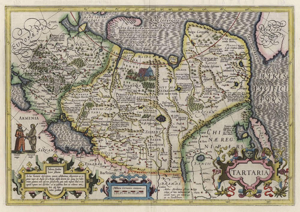 Jodocus Hondius lovely map of Tartaria, first issued in the 1606 Mercator-Hondius series of atlases. Beautiful 'silk' engraving of the Oceans, typical of Jodocus Hondius. Highly appealing map of the region.