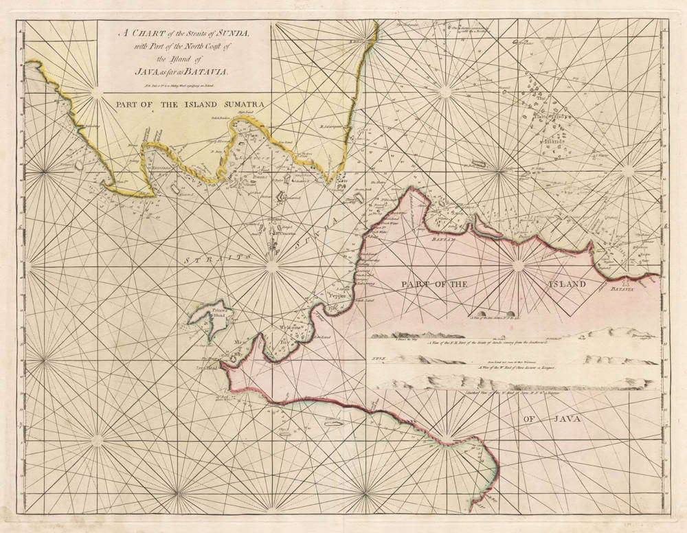 Detailed sea chart of Sunda Strait, produced for the by Samuel Dunn, hydrographer and nautical teacher and examiner of pilots for the English East India Company (EEIC) from 1774 until 1794.