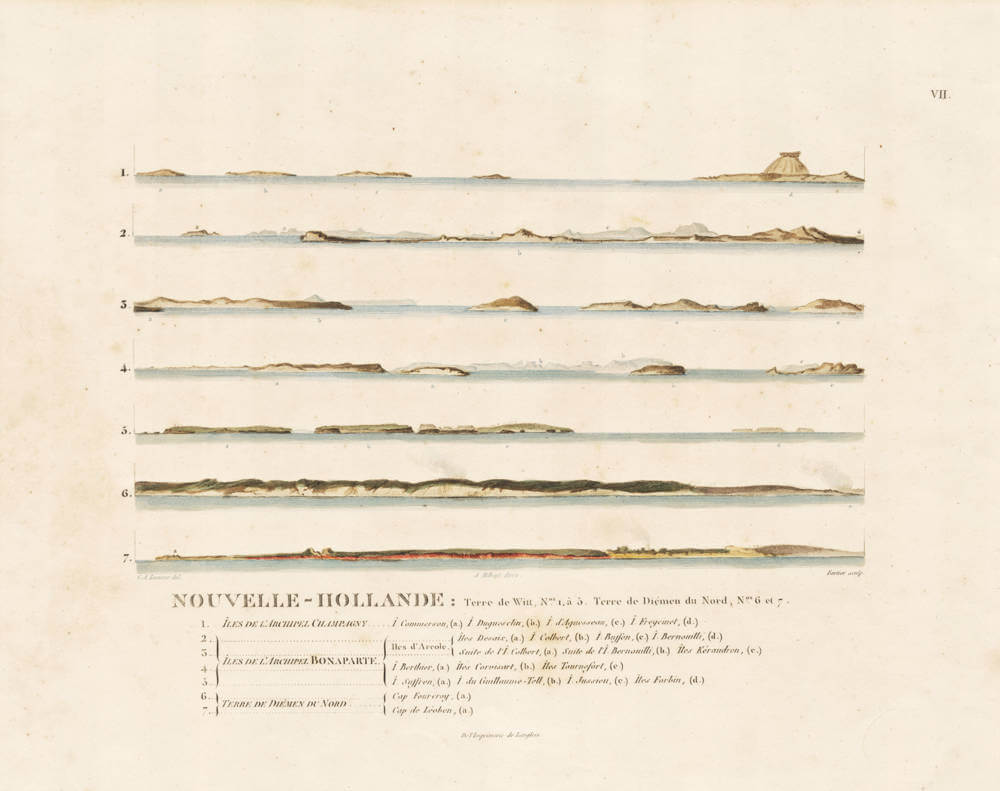 One of the duties for the artists on board the Baudin voyage was to keep a pictorial record of events. This illustrations by the expedition's talented artist Charles Lesueur shows coastal profiles.