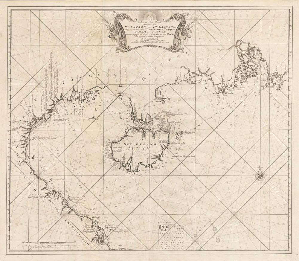 The chart covers the Gulf of Tonkin, the coasts of northern Vietnam, the South China Sea, and southern China including Canton (Hangzhou), Macao and modern day Hong Kong. It was the most detailed and accurate chart at the time, based on 150 years of VOC chartings that had been secret and that had only been available for internal VOC use.