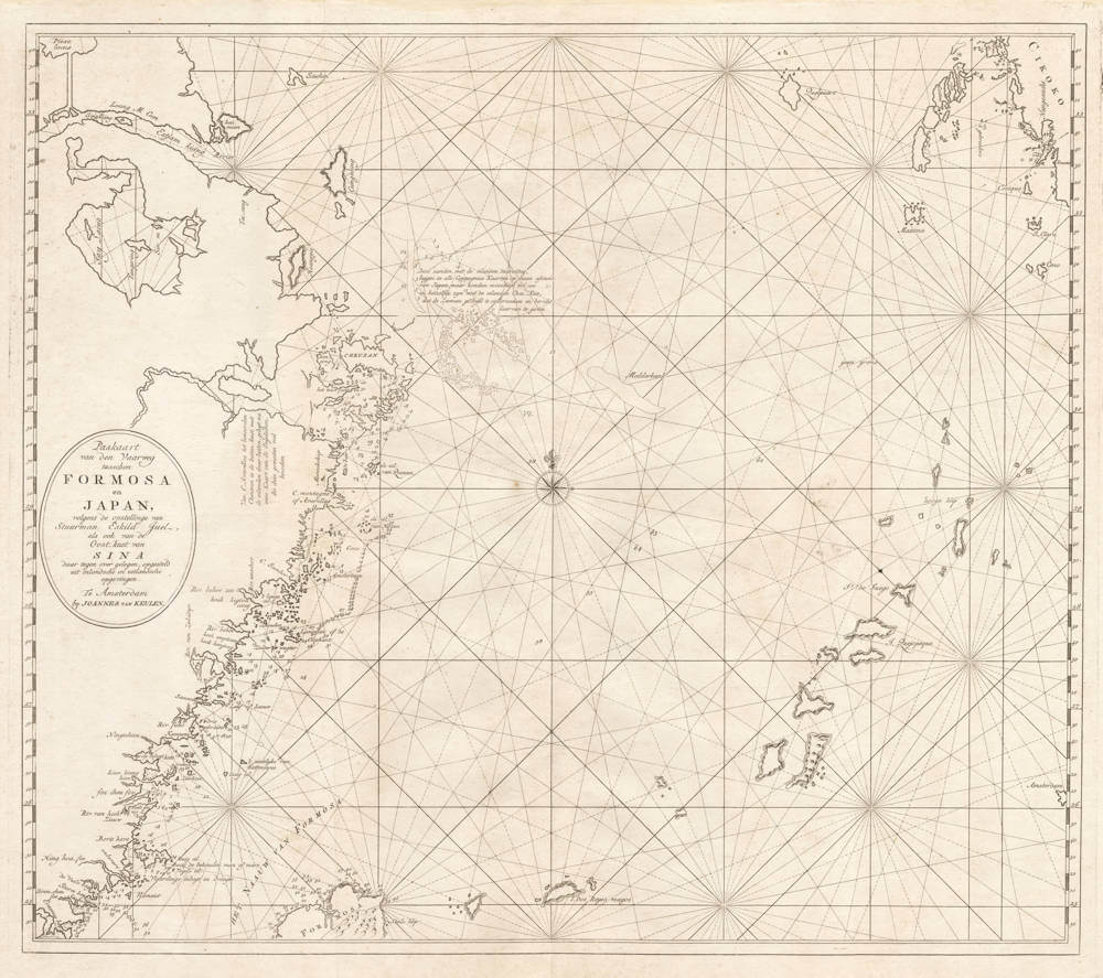 The chart is centered on the East China Sea, with the long string of islands and shoals from Taiwan to Japan, including Okinawa. It was the most detailed and accurate chart at the time, based on 150 years of VOC charting that had been secret and that had only been available for internal VOC use.