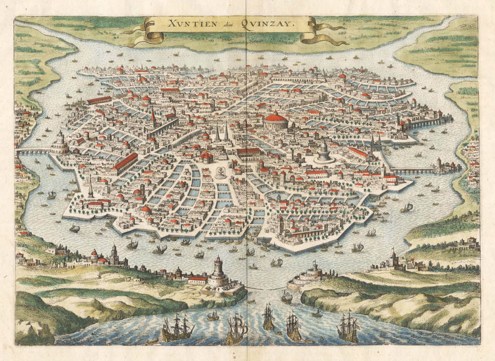 In 1638 Merian also borrowed the Quinsay image from Thevet, added many details, and published his version in copperplate of Xuntien alias Quinzay in Pierre d’Avity’s Neuwe Archontologia cosmica (Frankfurt, 1638, following p. 680). That is the map depicted and described here.