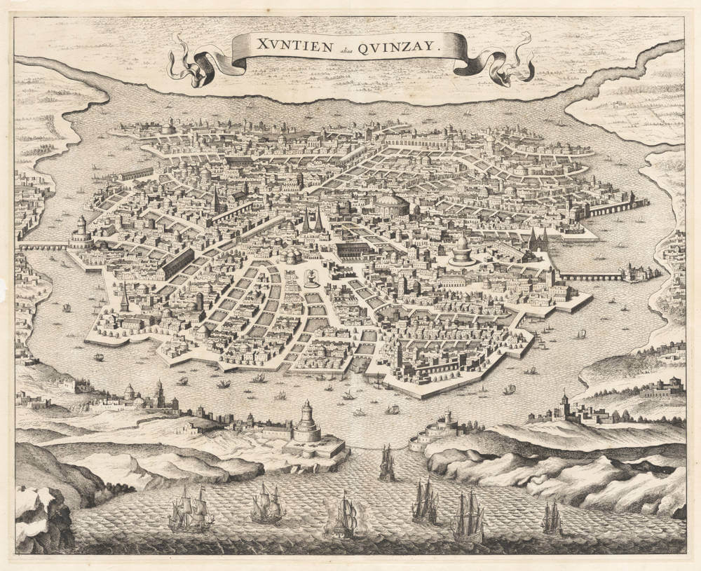 In 1638 Merian also borrowed the Quinsay image from Thevet, added many details, and published his version in copperplate of Xuntien alias Quinzay in Pierre d’Avity’s Neuwe Archontologia cosmica (Frankfurt, 1638, following p. 680).