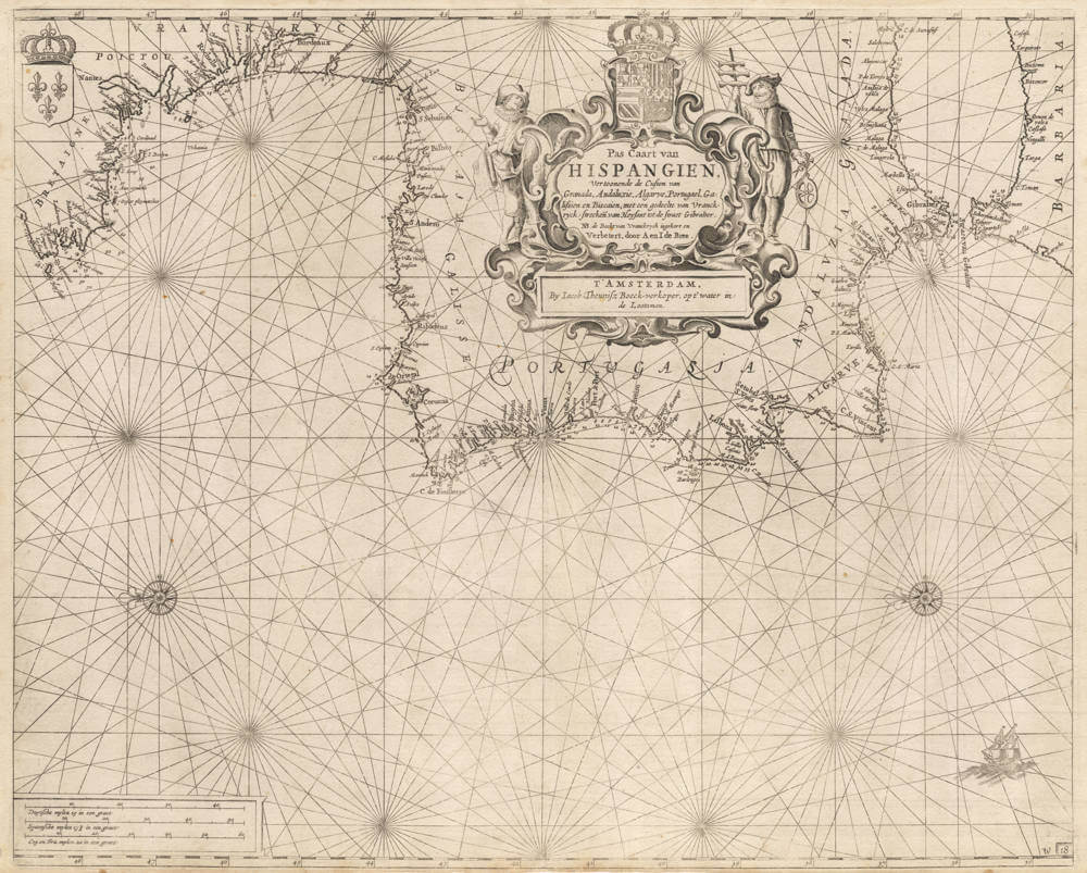 Very rare and important navigation chart of the coasts of Spain and Portugal by Jacob Theuniszoon. All his charts are prototypes and exceptionally difficult to find.