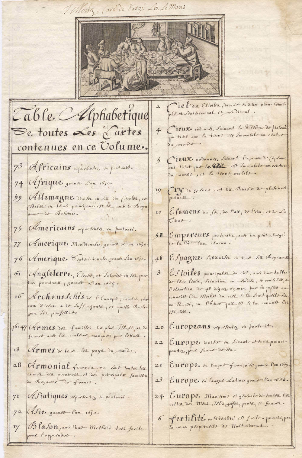 The handwritten table of contents lists 77 French maps of all parts of the world , as well as prints of patriarchs, kings, emperors, as well as a perpetual calendar and longitudes and latitude tables for places all over the world.