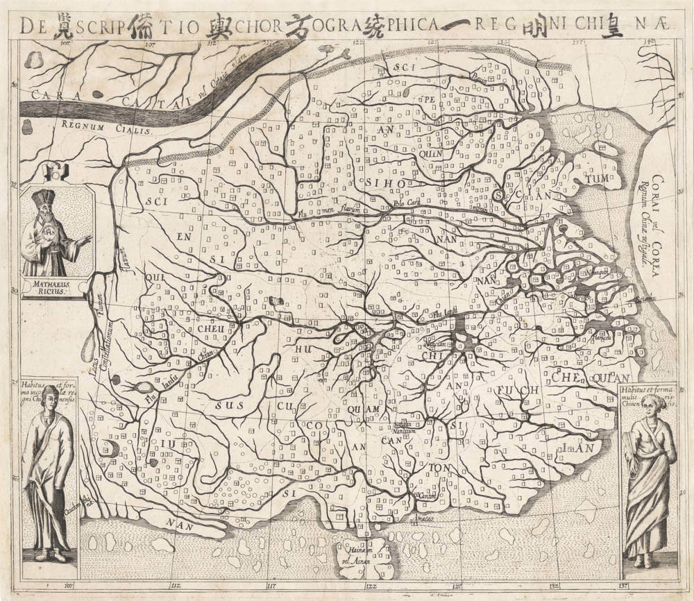 The Jesuit missionary Matteo Ricci is portrayed in the western margin, while the lower corners contain vignettes of male and female Chinese costume.