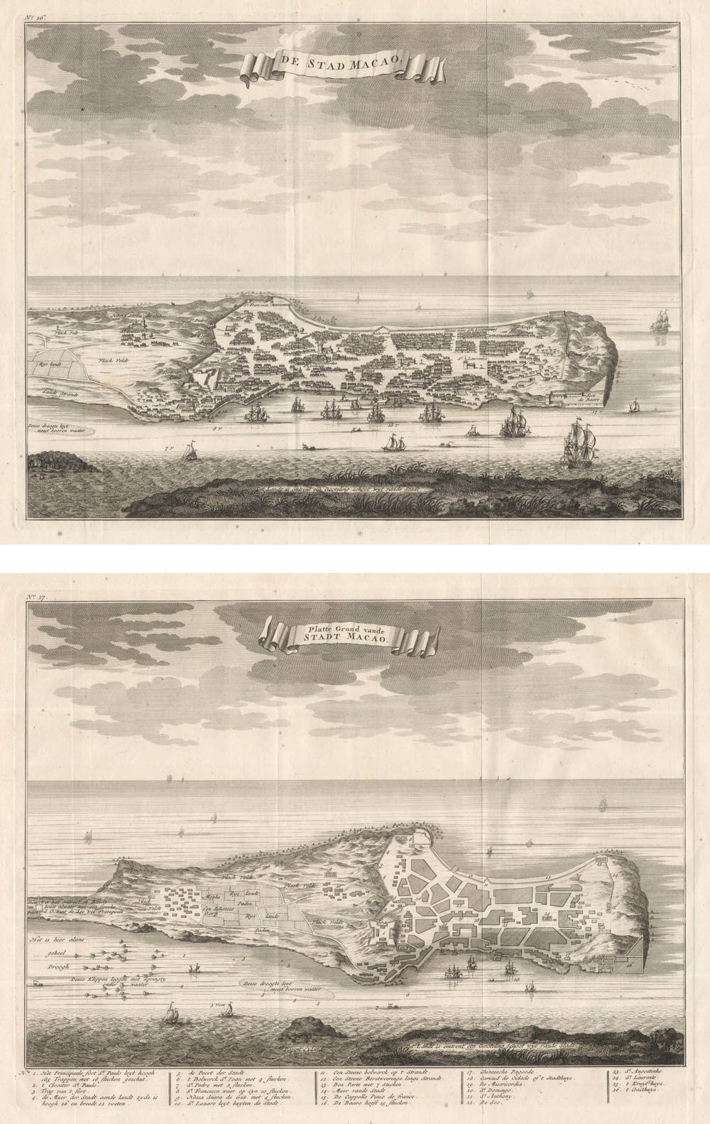 The earliest detailed and accurate maps of the Portuguese trading post of Macao (Macau). Complete set of two, one a bird eye's view and one a plan of the city, published in 1724 by Valentijn who had access to the VOC records in Batavia and based on their intelligence. Macao had been sieged and attacked several times by the VOC, with no success.