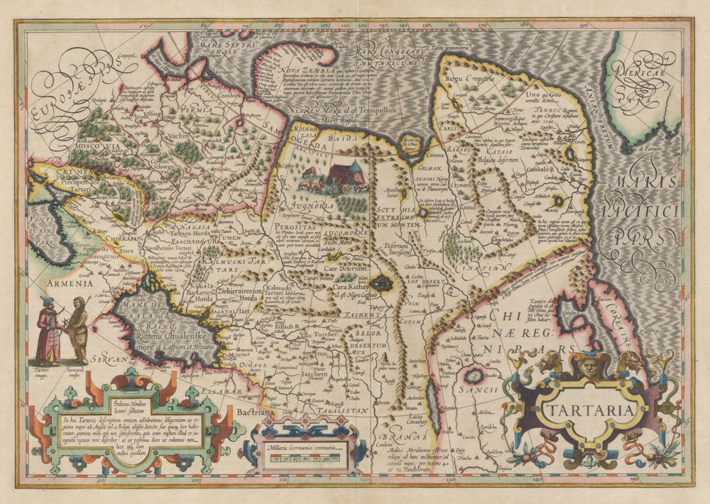 Jodocus Hondius lovely map of Tartaria, first issued in the 1606 Mercator-Hondius series of atlases. Beautiful 'silk' engraving of the Oceans, typical of Jodocus Hondius. Highly appealing map of the region.