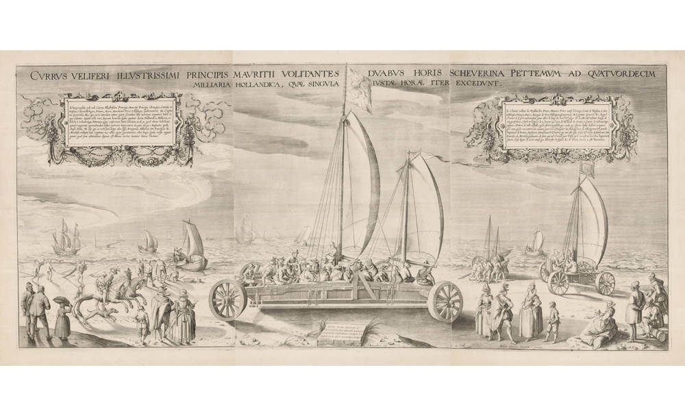 [The sailing cars of the most illustrious Prince Maurits, which in the space of two hours swept from Scheveningen to Petten, covering 14 Dutch miles, each of which requires a full hour of travel]