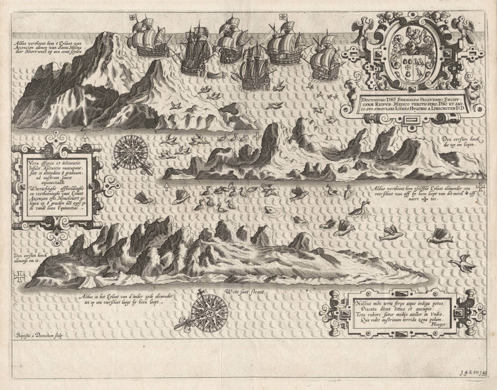 Linschoten's spectacular bird eye's views of Ascensiun Island, from his Itinerario.