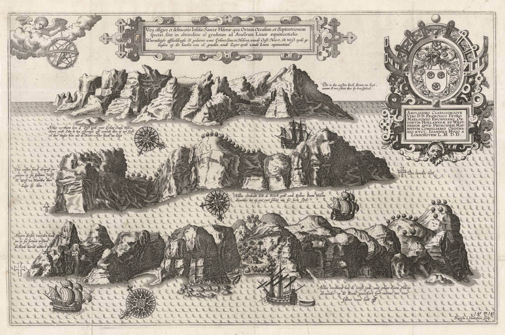 Jan Huygen van Linschoten's detailed view of Saint Helena, a watering and victualling base for Portuguese fleets on the return voyage from the Indies. Ships got only one chance to hit the small island, because there was no turning back against the winds and currents. Sometimes the last fresh water was taken in at Mozambique, but often Goa had been their last port. Linschoten gives a detailed account of how to recognize the island, how to round it, how to sail in safely, and where to get water and food. Views from three sides are given, because coming from the Cape one has to sail around the island for safe anchorage. Recommended sailing distance off the southern coast is given as "one harquebus shot". Richly ornamented cartouches and Portuguese coat of arms. Engraved by Baptista van Doetichum. From Linschoten's Itinerario.
