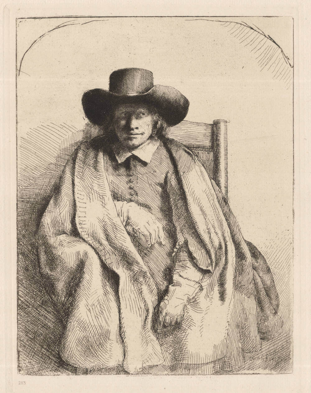 Clement de Jonghe (1624/25-1677) was among the largest Amsterdam print and map dealers and publishers during the mid-17th century and would certainly have been associated with Rembrandt (1606-1669), though there is no indication, through letters or in the inventory drawn up after Clement de Jonghe's death, that this was a commissioned portrait. De Jonge's business prospered from at least around 1647 to 1679, run posthumously for a couple of years following his death by his widow Jacomijntje Jacobs, until his stock was sold at auction. De Jonghe acquired at least 74 of Rembrandt's original etched copper plates, probably during Rembrandt's lifetime, and these were all sold in the contents of his estate auction. Bartsch 272; Biörklund 51-C; Hollstein (White and Boon) 272; New Hollstein 264.
