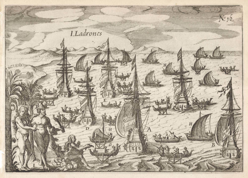 While crossing the Pacific Ocean, Joris van Spilbergen’s fleet stopped at the Ladrones islands in January 1616. Today they are the Mariana Islands. The fleet stayed here to collect fresh supplies, which were sorely needed. A number of people had died during the voyage across the Pacific. At the islands the fleet was welcomed, however, and succeeded in bartering for supplies.