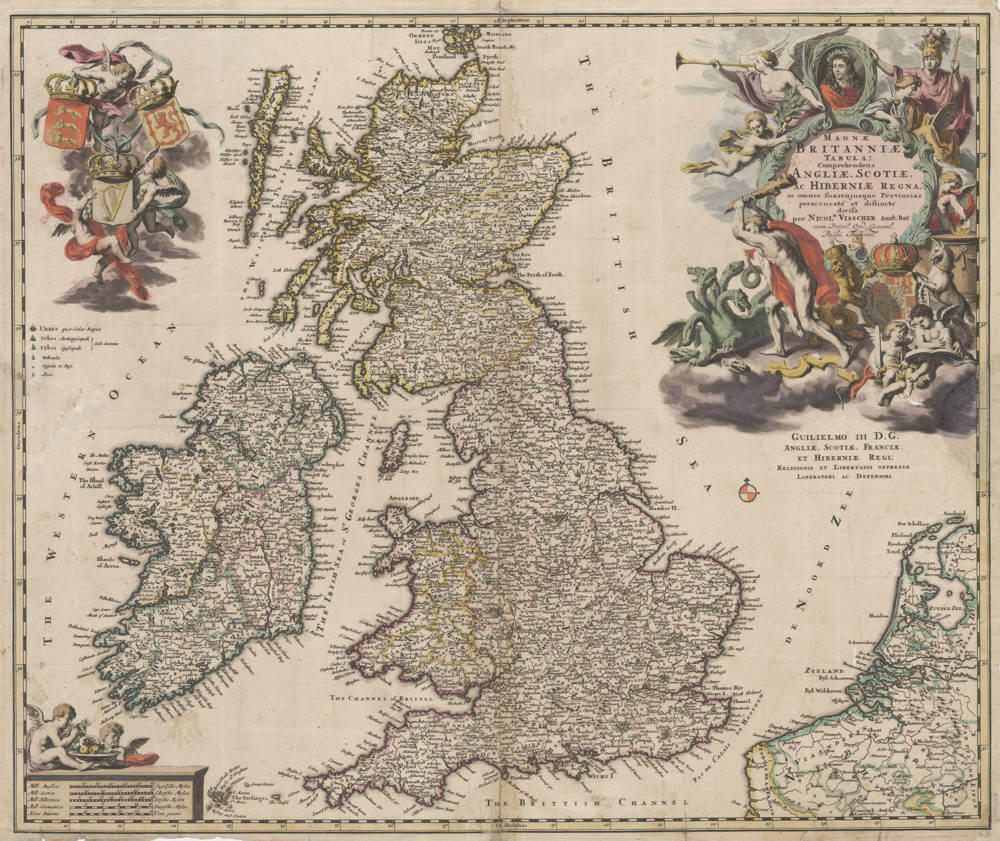Nicolaes Visser's second map of the British Isles, dedicated to King William III and quite distinct from Visscher's earlier map of Britain.