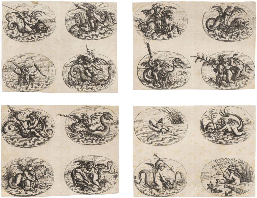 Four sheets with legendary and iconic engravings/etchings, each sheet with four oval grotesques, depicting a total of sixteen scenes with mermaids, mermen, putti, sea horses and sea monsters. All drawn and copper-engraved/etched by Christoph Jamnitzer.