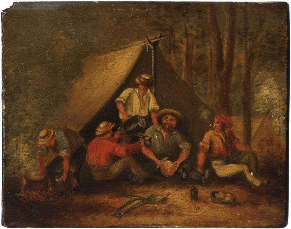 Gold diggers hut of canvas and bark in the Australian gold fields in the 1850s. The Australian population of 437,655 doubled in the 1850's stimulated by the gold rush.