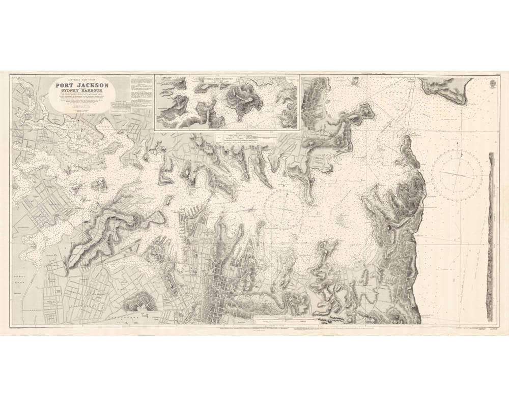 Very large seminal sea chart of Sydney Harbour, printed and used by the British Admiralty based on information by the New South Wales Government, 1887.