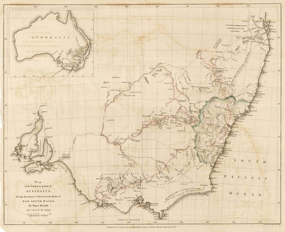Very rare early 1837 broadside map of New South Wales, showing in detail the results of Thomas (or Major) Mitchell's three explorations of 1831, 1835 and 1836 into Southeastern Australia.