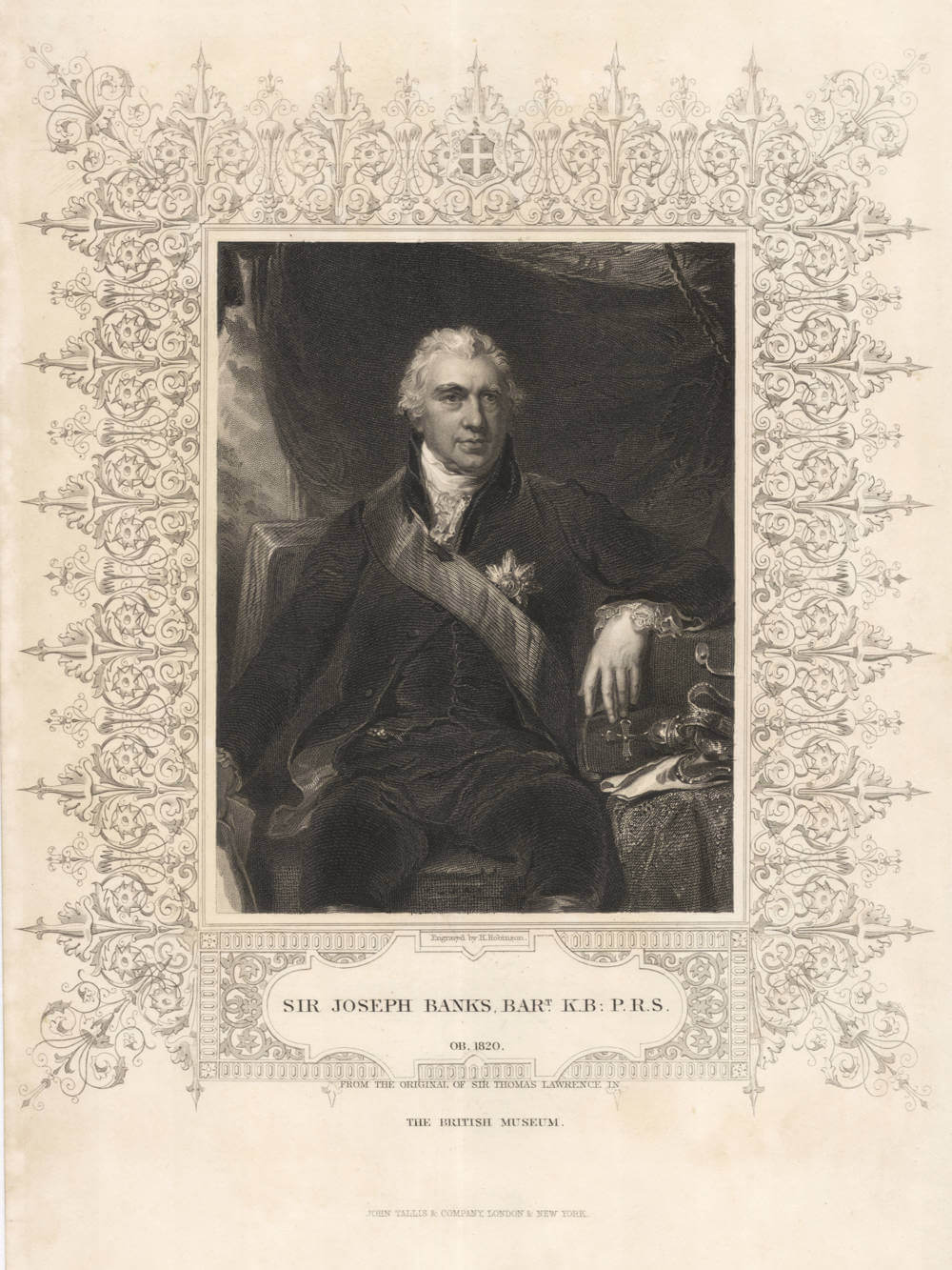 The botanist Joseph Banks accompanied Captain James Cook on his round the world voyage of 1768-71 but was left behind on the second. The forceful Banks is seen here as President of the Royal Society, to which he was elected in 1778, with the Society’s mace donated by Charles II on the table. He wears the Star and ribbon of the Order of the Bath, to which he was appointed in July 1795. As President he became an ex officio Trustee of the Museum and donated ethnographical material, manuscripts and Icelandic printed books. His library was bequeathed on complicated terms after his death.