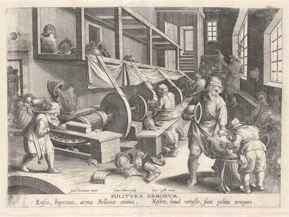 The composition emphasizes the importance of armor maintenance in the context of warfare and personal protection. By illustrating the polishing process, Stradanus underscores the advancements in metallurgical techniques and the aesthetic considerations of armor as both functional and decorative art.