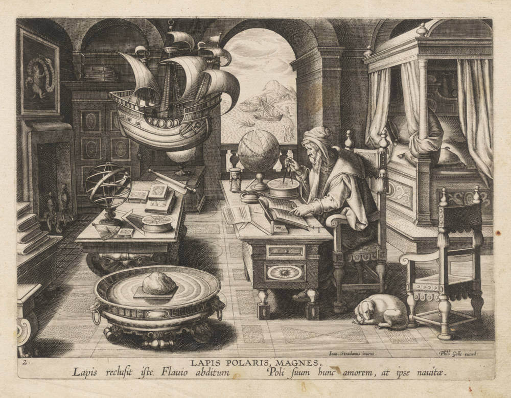 Legendary and iconic engraving by Philip Galle of the invention of the compass, after a drawing by Jan van der Straet (Stradanus).