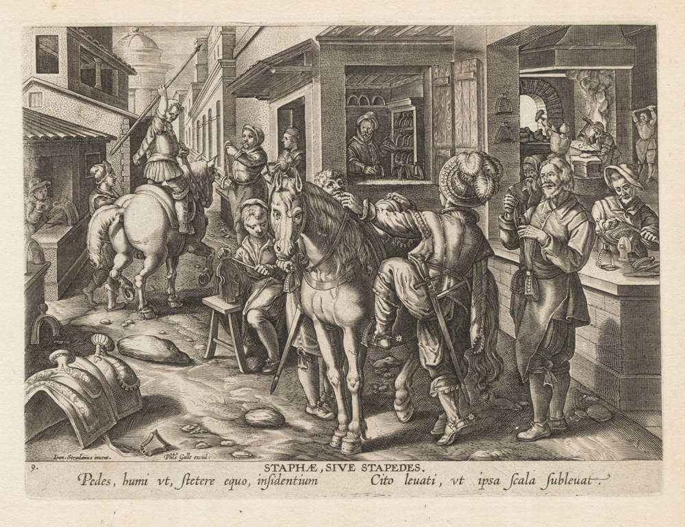 Legendary and iconic engraving by Philip Galle of the invention of stirrups, after a drawing by Jan van der Straet (Stradanus).
