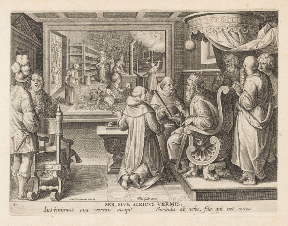 Although the silkworm was described by Aristotle and silk was imported by Greeks and Romans, it remained for two Persian monks who had resided in China to smuggle some eggs of silkworms in a bamboo cane and to present them to Emperor Justinian in Constantinople in about the year 550, as shown above. The entire silk industry of the West grew out of this beginning. In the background women tend the silk-moth, cultivating the mulberry trees on the leaves of which the moth thrives, and reeling the silk from cocoons upon frames. So important was the innovation of the silkworm to the economy of Europe that Stradanus added a set of six plates under the title Vermis Sericus (The Silkworm), to his series.