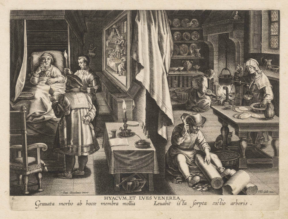 Legendary and iconic engraving by Philip Galle of the invention of a cure for syphilis, after a drawing by Jan van der Straet (Stradanus).
