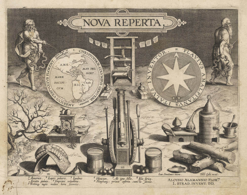 The title plate, engraved by Jan Collaert I after Stradanus's design and published by Philips Galle around 1588, features the title "NOVA REPERTA" prominently at the top. Below this, a central image depicts a printing press, symbolizing the revolution in information dissemination. Flanking the press are two medallions: the left one portrays the Americas, referencing the age of exploration, while the right one represents a compass with the Southern Cross, indicating advancements in navigation. To the left, a female figure personifies the future, pointing towards a map of the Americas and Pacific, and to the right, an elderly man symbolizes the past, retreating from the scene. At the bottom, various objects represent other notable inventions, each numbered and corresponding to descriptions inscribed below the image.