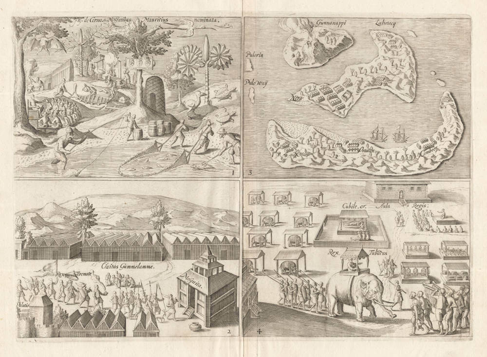 The image is a mirror copy of the same view in van Neck's Journal of the second fleet, and is famous for being the first depiction of the soon extinct Dodo bird.