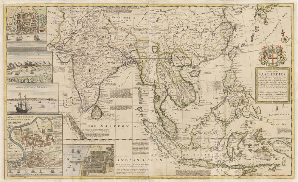 The map includes detailed insets of the strategic trading posts of Bantam (Dutch), Goa (Portuguese), Surat (British), Madras (British), and Batavia (Dutch), the footholds of various European powers at the peak of their influence. The map is richly annotated with information about local produce and markets. These annotations highlight the commercial and political landscape of the time, especially the dominance of the British East India Company (EIC), which by 1720 was responsible for 15% of Britain's imports.