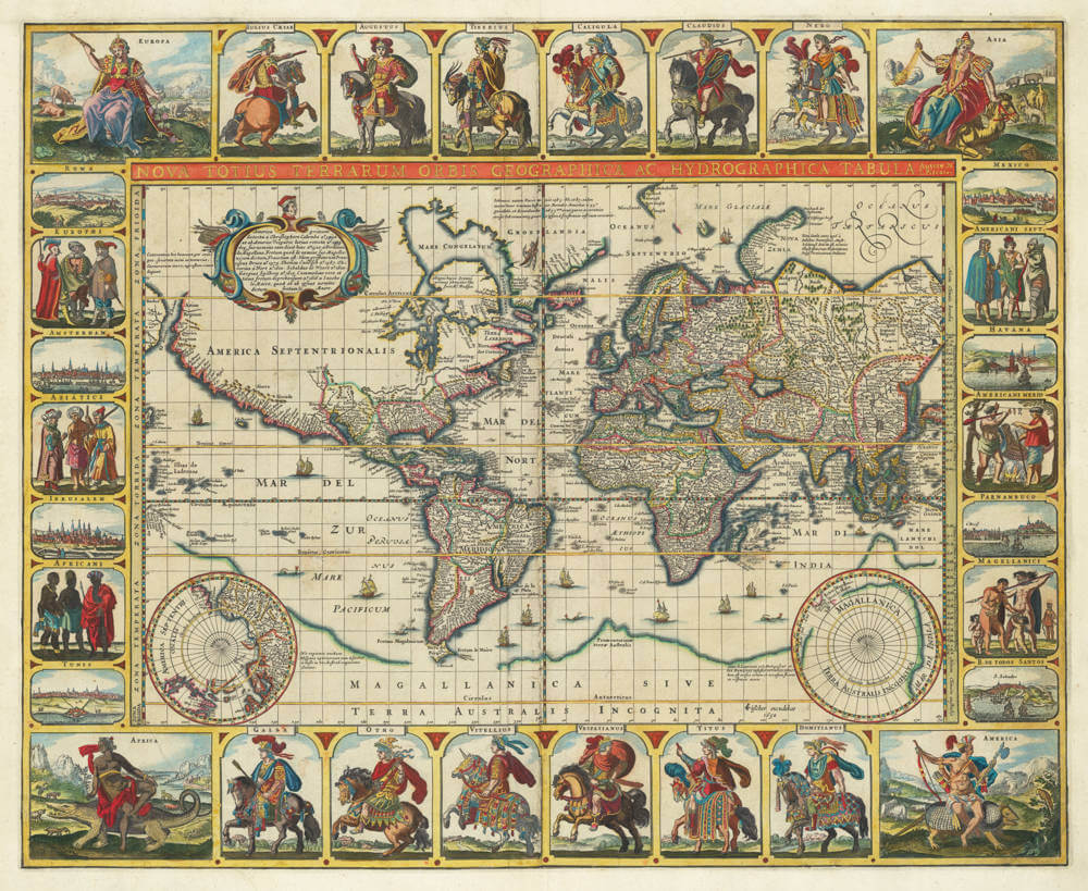 The map is only one of nine Dutch single-sheet world maps with decorated borders that were published in the 17th Century.