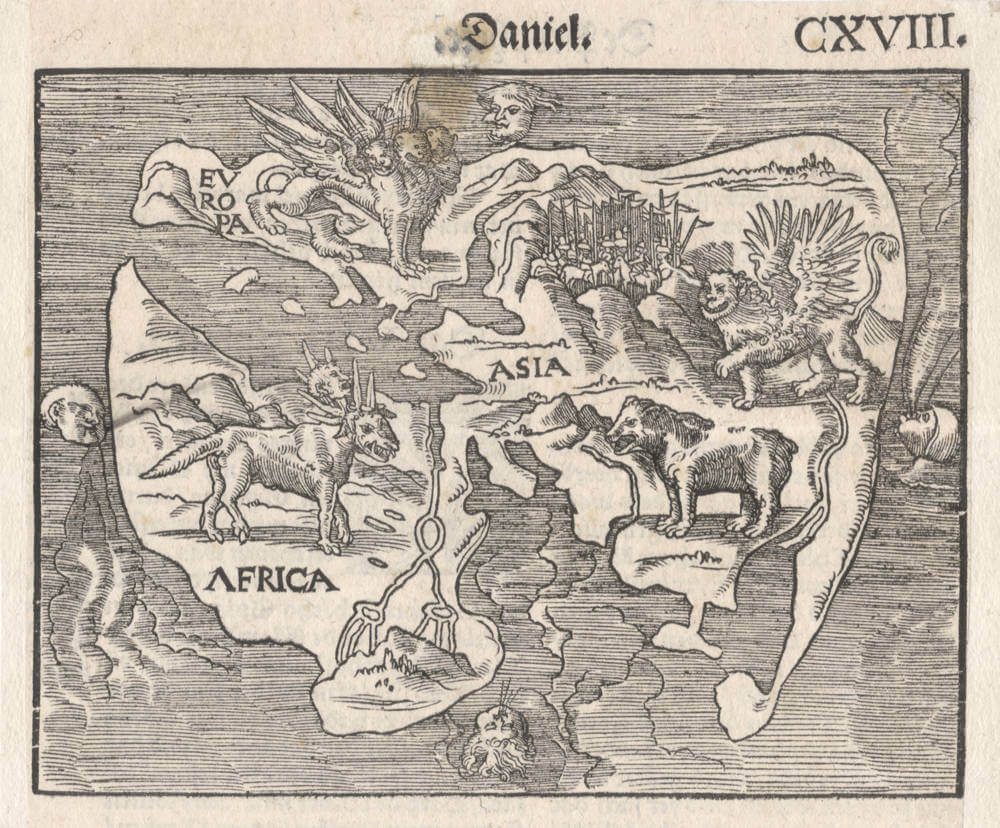 At the time of its first publication as the sixty-first world map to go into print, it was, on the one hand, a depiction of the Old World, based on the Ptolemaic world view but including a number of recent Spanish and Portuguese discoveries, but on the other, a visualisation of the prophet Daniel’s apocalyptic dream of the four kingdoms.