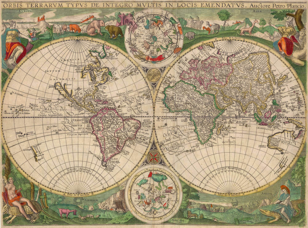 Petrus Plancius' famed world map in two hemispheres from 1594 (Shirley 187), distinguished by its contemporaneously good cartographical representation and its decorative appearance, served as a model for several world maps. Some appeared as separate folio maps on the market and belong today to major cartographic rariora. Certainly counted among these is the world map published by Paul de la Houve around 1600 in Paris, which subsequently, after the disclosure of Tasman’s results, was updated by Hugo Allard in Amsterdam around 1650.