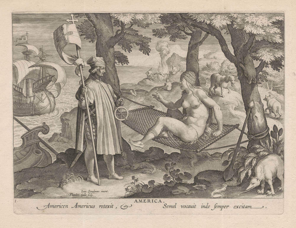 In the print, as in the drawing upon which it is based, Europe’s encounter with America is portrayed as the meeting between a man, whose astrolabe, standard and ships aid in his identification as Amerigo Vespucci, and a nude woman, seated on a hammock, who represents the New World or America. Studies of this image have emphasized its use of gender and sexuality as metaphors for the exploration and conquest of territory, here cast in terms of a series of pictorial oppositions including those of female/male, nude/clothed, reclining/standing and nature/culture.
