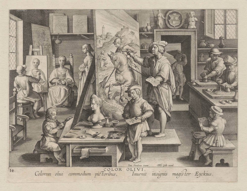 Iconic engraving by Philip Galle of the invention of oil painting, after a drawing by Jan van der Straet (Stradanus).