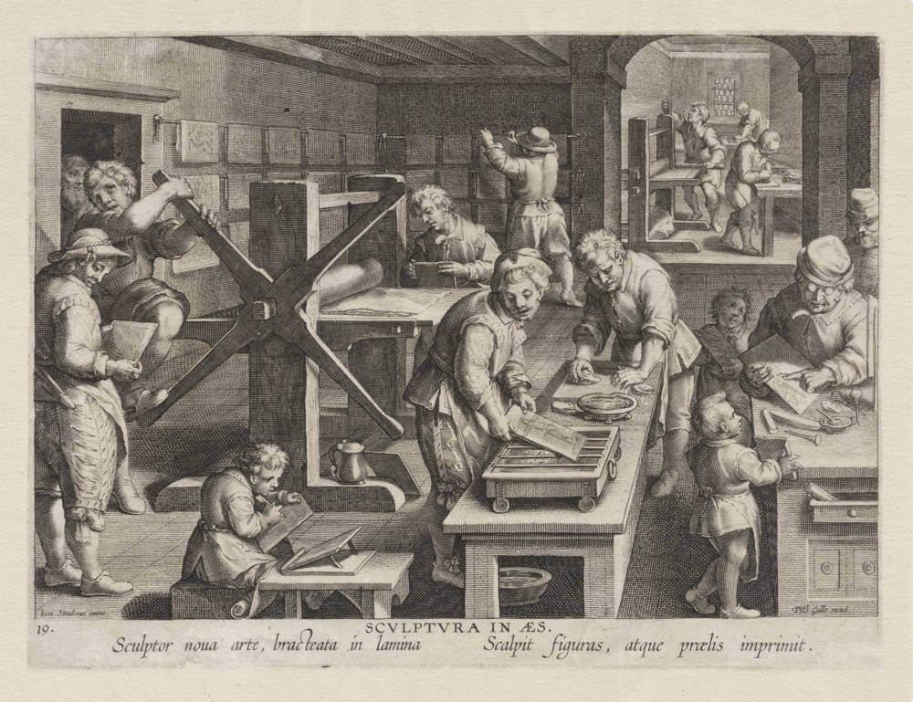 Stradanus' iconic masterprint of the invention of copperplate printing is the first detailed image of this subject.
