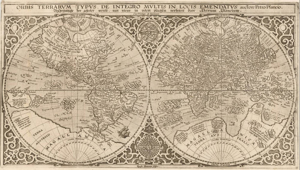 This is the first world map published by Petrus Plancius, preceding his famous world map of 1594.