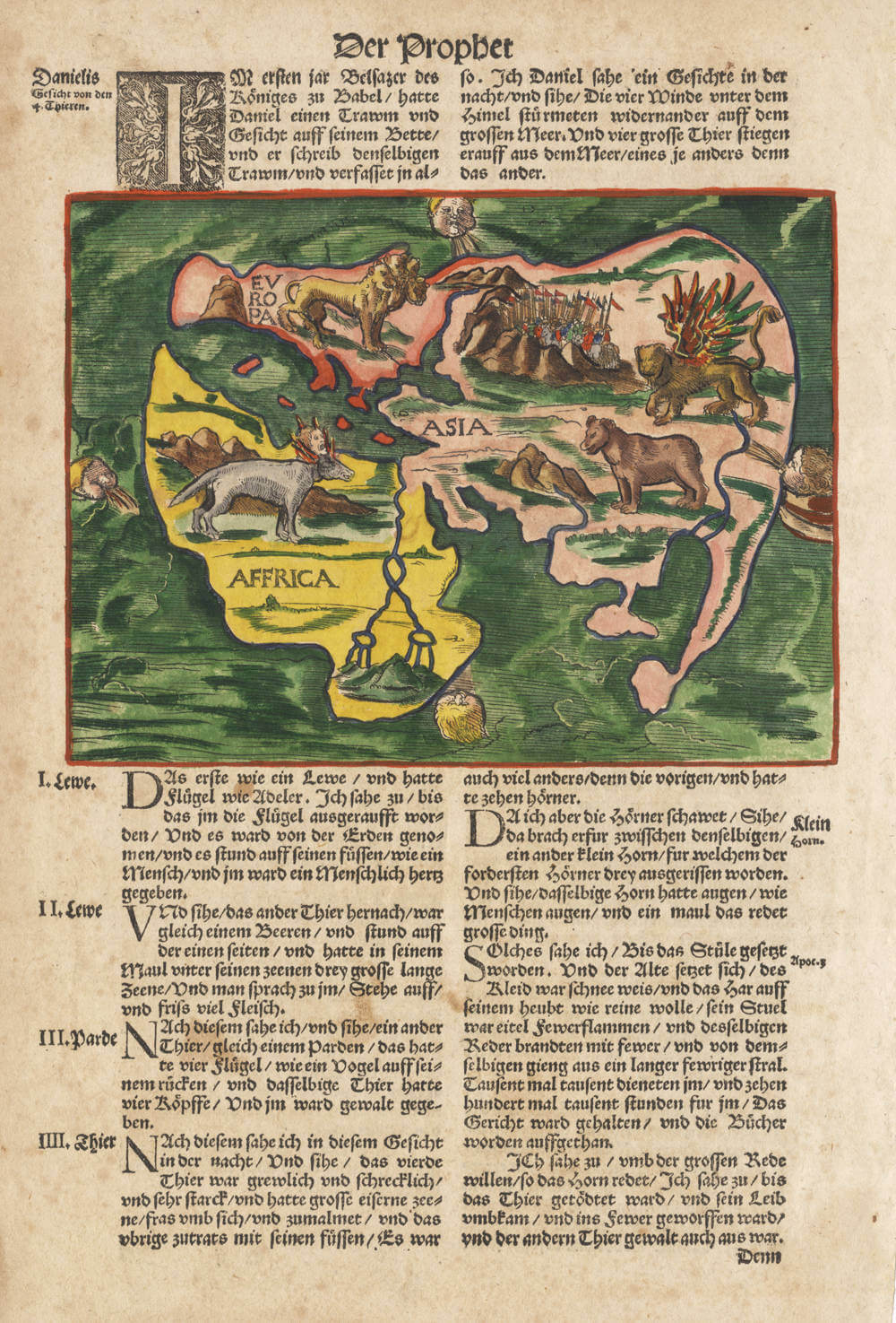 The map itself is a crude woodcut showing the four beasts of Daniel's dream and the simplified continents of Europe, Africa and Asia; there are four windheads. It is known as the 'Wittenberg World Map' or 'Daniel's Dream Map,' and in its biblical context usually appears amid a page of text headed 'Der Prophet.'