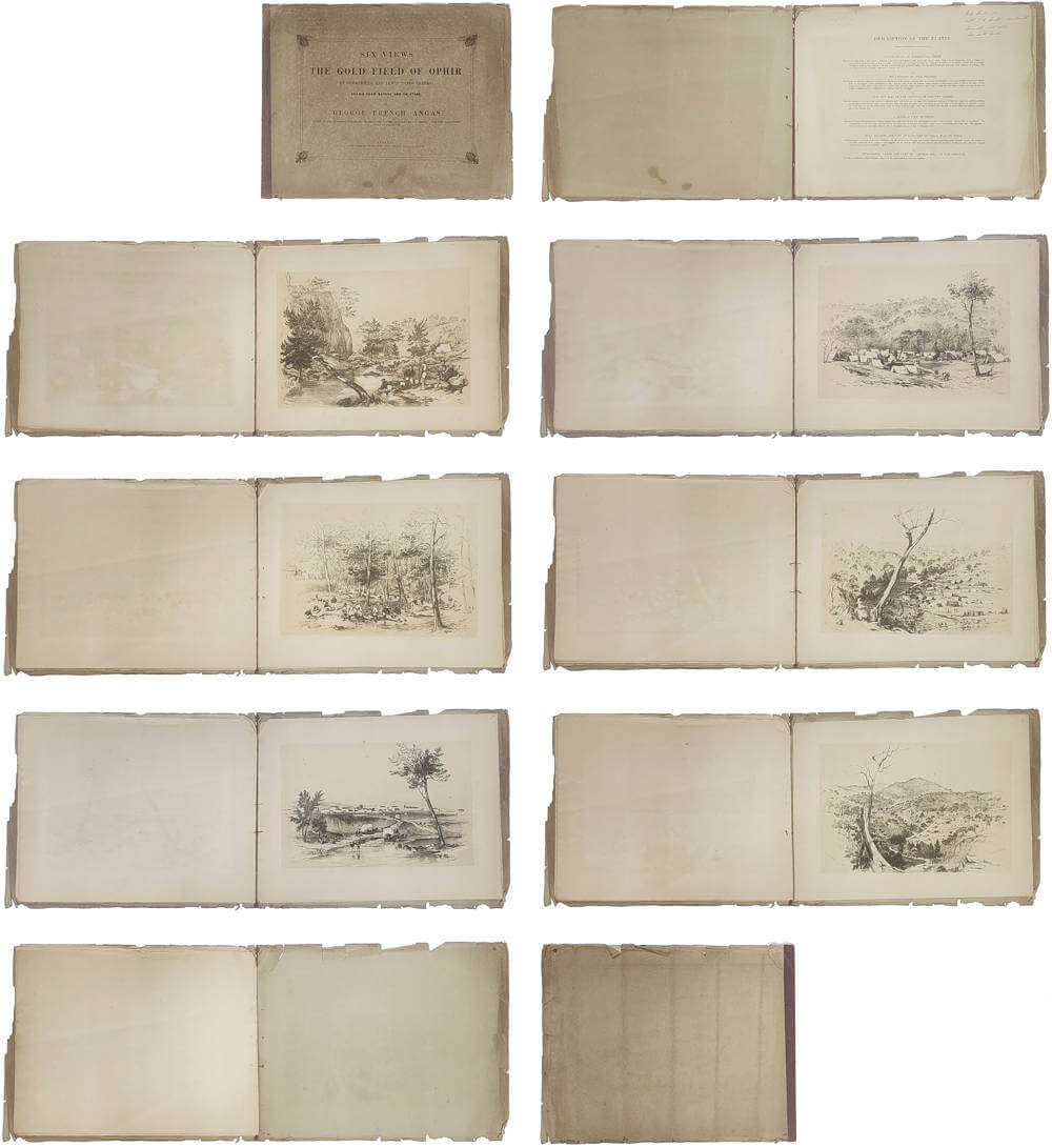 The first illustrated book to record the beginning of the Australian gold rush. On 29 April, 1850, on the prompting of Edmund Hammond Hargraves, the Sydney Morning Herald reported the discovery of gold near Bathurst in a brief announcement. Shortly after Hargraves had announced the discovery of gold at Ophir, Angas hastened from Sydney to Bathurst. He was the first artist to arrive on the goldfield, and Six Views is not only the first pictorial record of the beginning of the Australian gold rushes, it is in fact the only substantial visual record of the relatively short-lived New South Wales goldfields ever to have been published. The lithographs are considered to be among Angas's most satisfying work. Drawn on the stone by Angas himself, the plates show him, with his expert handling of the lithographic medium, at the peak of his artistic achievement: they are among his most successful artistic productions; carefully composed and delicately, but firmly, executed, making expert use of the technical possibilities of the lithographic process to produce a very pleasing pencil like texture, with subtle highlights in the buff-coloured background (Tregenza).